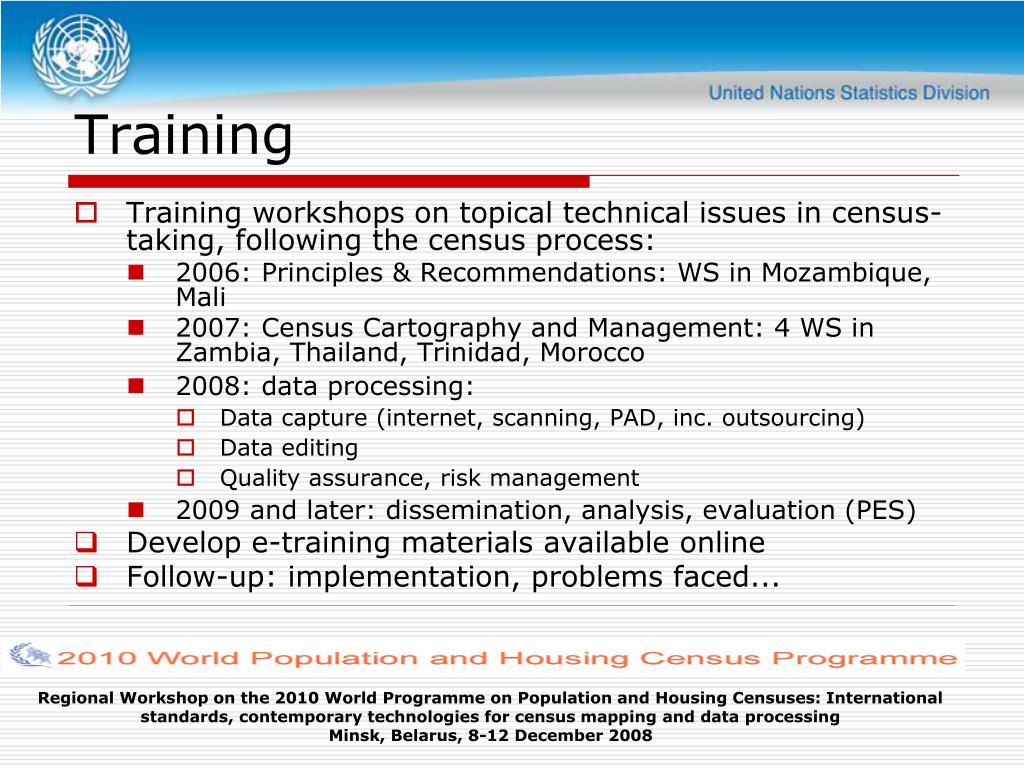 Training • Training workshops on topical technical issues in census-taking, following the census process: • 2006: Principles & Recommendations: WS in Mozambique, Mali • 2007: Census Cartography and Management: 4 WS in Zambia, Thailand, Trinidad, Morocco • 2008: data processing: • Data capture (internet, scanning, PAD, inc. outsourcing) • Data editing • Quality assurance, risk management • 2009 and later: dissemination, analysis, evaluation (PES) • Develop e-training materials available online • Follow-up: implementation, problems faced... Regional Workshop on the 2010 World Programme on Population and Housing Censuses: International standards, contemporary technologies for census mapping and data processing Minsk, Belarus, 8-12 December 2008