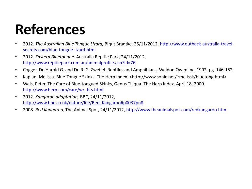 References 2012. The Australian Blue Tongue Lizard, Birgit Bradtke, 25/11/2012, http://www.outback-australia-travel-secrets.com/blue-tongue-lizard.html 2012. Eastern Bluetongue, Australia Reptile Park, 24/11/2012, http://www.reptilepark.com.au/animalprofile.asp?id=76 Cogger, Dr. Harold G. and Dr. R. G. Zweifel. Reptiles and Amphibians. Weldon Owen Inc. 1992. pg. 146-152. Kaplan, Melissa. Blue-Tongue Skinks. The Herp Index. <http://www.sonic.net/~melissk/bluetong.html> Weis, Peter. The Care of Blue-tongued Skinks, Genus Tiliqua. The Herp Index. April 18, 2000. http://www.herp.com/care/wr_bts.html 2012. Kangaroo adaptation, BBC, 24/11/2012, http://www.bbc.co.uk/nature/life/Red_Kangaroo#p0037pn8 2008. Red Kangaroo, The Animal Spot, 24/11/2012, http://www.theanimalspot.com/redkangaroo.htm