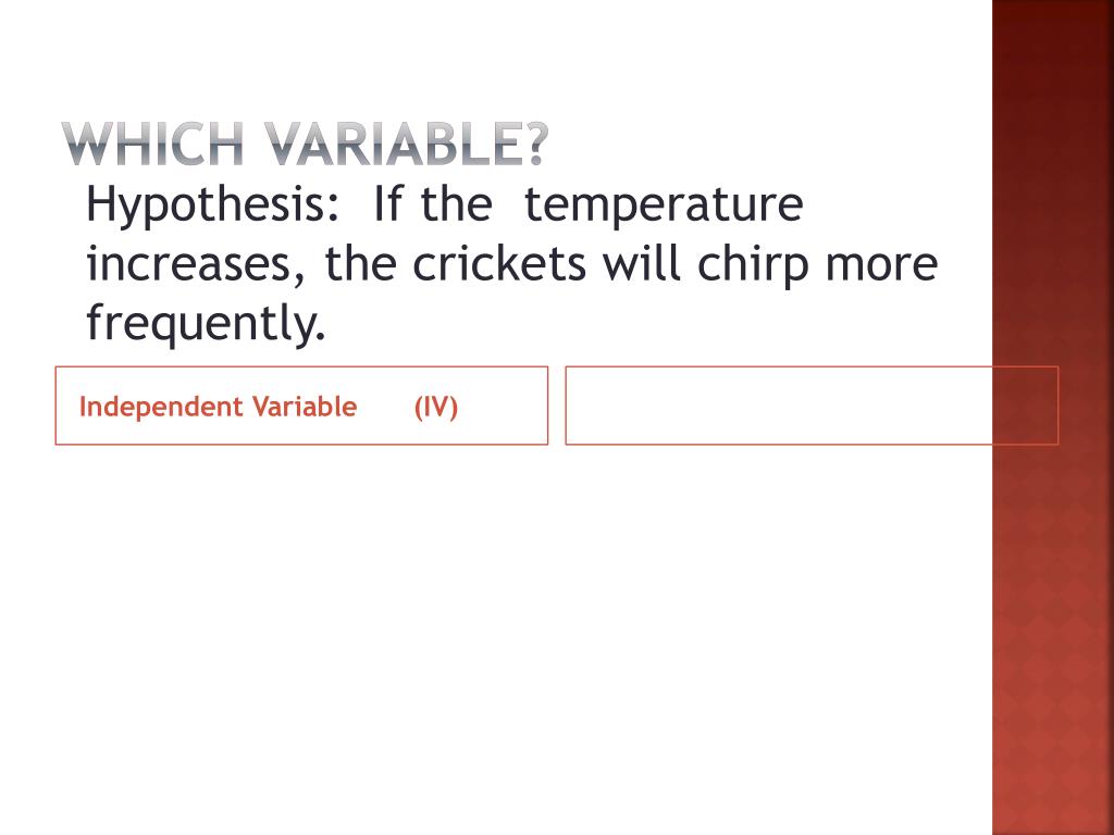 Which variable? Hypothesis: If the temperature increases, the crickets will chirp more frequently. Independent Variable (IV)