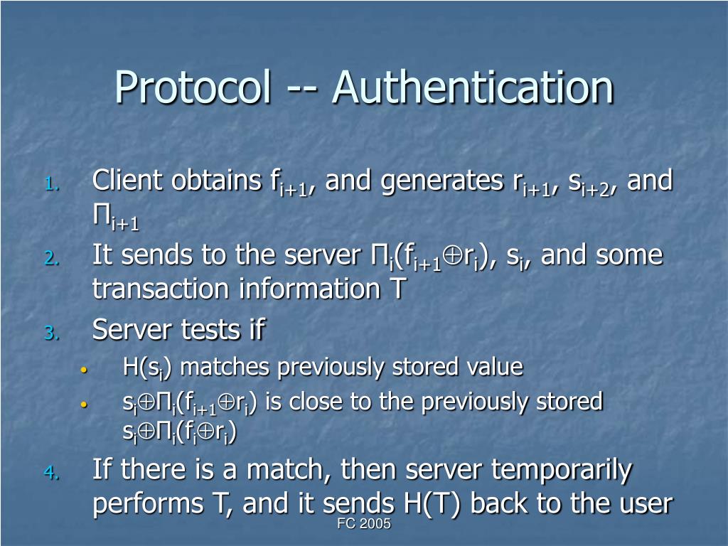 Protocol -- Authentication • Client obtains fi+1, and generates ri+1, si+2, and Πi+1 • It sends to the server Πi(fi+1ri), si, and some transaction information T • Server tests if • H(si) matches previously stored value • siΠi(fi+1ri) is close to the previously stored siΠi(firi) • If there is a match, then server temporarily performs T, and it sends H(T) back to the user FC 2005
