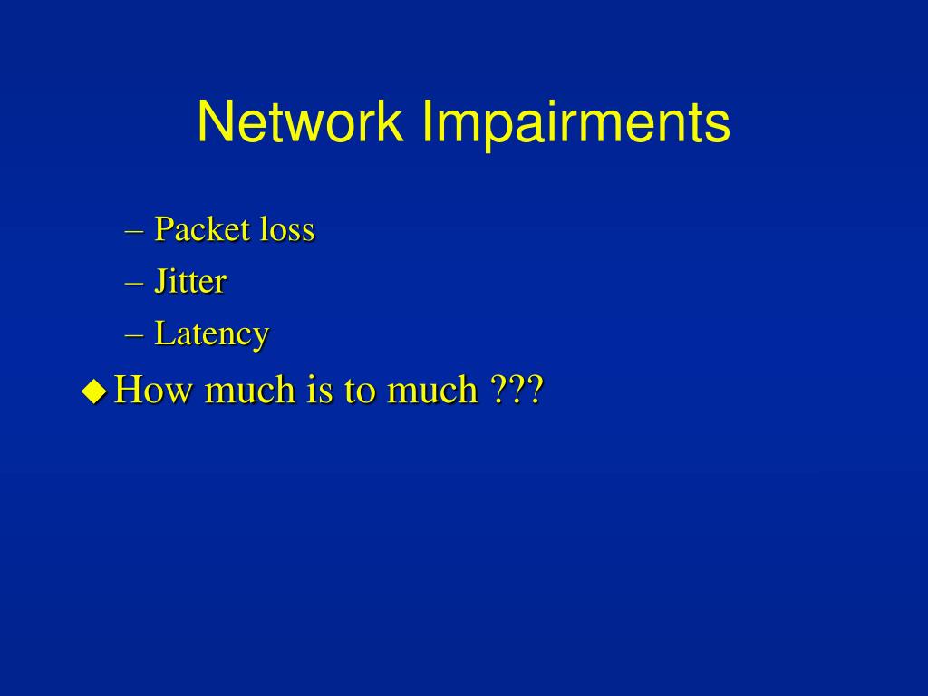 Network Impairments • Packet loss • Jitter • Latency • How much is to much ???
