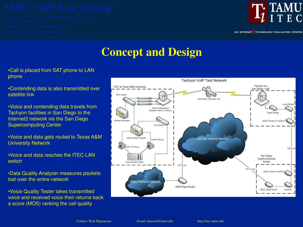 ADEC VoIP Beta Testing American Distance Education Consortium (ADEC) Tachyon Networks, Inc. Internet2 Technology Evaluation Center Department of Telecommunications Texas A&M University, College Station, TX 77843 Concept and Design • Call is placed from SAT phone to LAN phone • Contending data is also transmitted over satellite link • Voice and contending data travels from Tachyon facilities in San Diego to the Internet2 network via the San Diego Supercomputing Center • Voice and data gets routed to Texas A&M University Network • Voice and data reaches the ITEC LAN switch • Data Quality Analyzer measures packets lost over the entire network • Voice Quality Tester takes transmitted voice and received voice then returns back a score (MOS) ranking the call quality Contact: Walt Magnussen Email: telecom@tamu.edu http://itec.tamu.edu