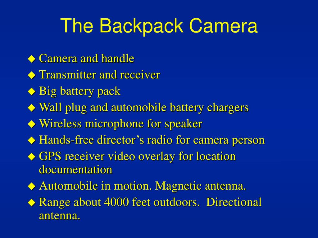 The Backpack Camera • Camera and handle • Transmitter and receiver • Big battery pack • Wall plug and automobile battery chargers • Wireless microphone for speaker • Hands-free director’s radio for camera person • GPS receiver video overlay for location documentation • Automobile in motion. Magnetic antenna. • Range about 4000 feet outdoors. Directional antenna.