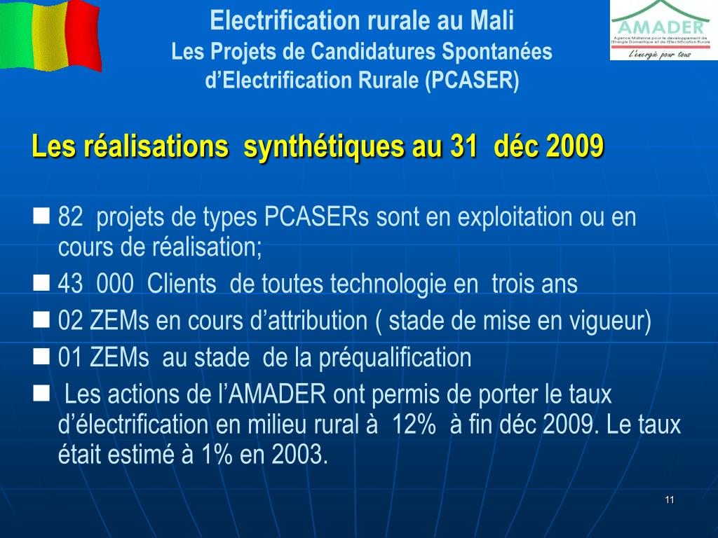 Electrification rurale au MaliLES STRATEGIES ET METHODES D’INTERVENTION DE L’AMADER La méthodologie est basée sur trois approches à l’issue desquelles une Autorisation d’Electrification Rurale est délivrée exclusivement à un opérateur par le Ministre chargé de l’énergie sur proposition de l’AMADER pour 12 ans ou 15 ans en fonction de la puissance installée: Les Appels d’Offres pour la réalisation et l’exploitation des Zones d’Electrification Multisectorielles (ZEM) : Les appels à propositions; Les Projets de Candidatures Spontanées Dans toutes ces approches d’électrification rurale toutes les technologies sont utilisées.