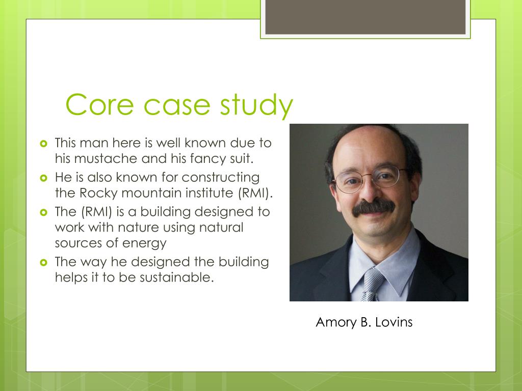 Core case study • This man here is well known due to his mustache and his fancy suit. • He is also known for constructing the Rocky mountain institute (RMI). • The (RMI) is a building designed to work with nature using natural sources of energy • The way he designed the building helps it to be sustainable. Amory B. Lovins