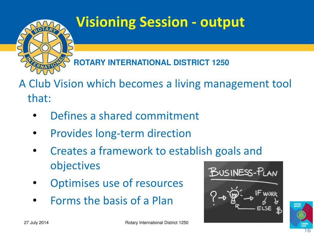 Visioning Session - output A Club Vision which becomes a living management tool that: • Defines a shared commitment • Provides long-term direction • Creates a framework to establish goals and objectives • Optimises use of resources • Forms the basis of a Plan Rotary International District 1250 16