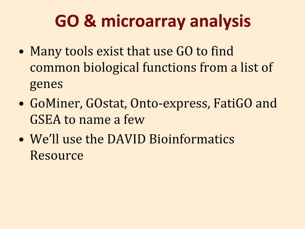 GO & microarray analysis • Many tools exist that use GO to find common biological functions from a list of genes • GoMiner, GOstat, Onto-express, FatiGO and GSEA to name a few • We’ll use the DAVID Bioinformatics Resource