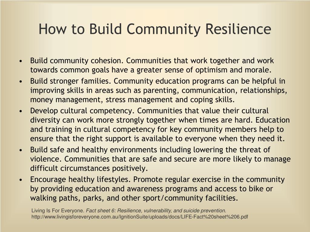 How to Build Community Resilience • Build community cohesion. Communities that work together and work towards common goals have a greater sense of optimism and morale. • Build stronger families. Community education programs can be helpful in improving skills in areas such as parenting, communication, relationships, money management, stress management and coping skills. • Develop cultural competency. Communities that value their cultural diversity can work more strongly together when times are hard. Education and training in cultural competency for key community members help to ensure that the right support is available to everyone when they need it. • Build safe and healthy environments including lowering the threat of violence. Communities that are safe and secure are more likely to manage difficult circumstances positively. • Encourage healthy lifestyles. Promote regular exercise in the community by providing education and awareness programs and access to bike or walking paths, parks, and other sport/community facilities. Living Is For Everyone. Fact sheet 6: Resilience, vulnerability, and suicide prevention. http://www.livingisforeveryone.com.au/IgnitionSuite/uploads/docs/LIFE-Fact%20sheet%206.pdf