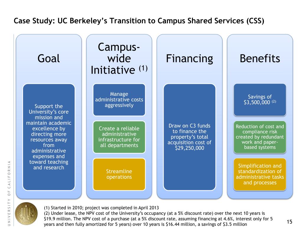 Case Study: UC Berkeley’s Transition to Campus Shared Services (CSS) (1) Started in 2010; project was completed in April 2013 (2) Under lease, the NPV cost of the University’s occupancy (at a 5% discount rate) over the next 10 years is $19.9 million. The NPV cost of a purchase (at a 5% discount rate, assuming financing at 4.6%, interest only for 5 years and then fully amortized for 5 years) over 10 years is $16.44 million, a savings of $3.5 million
