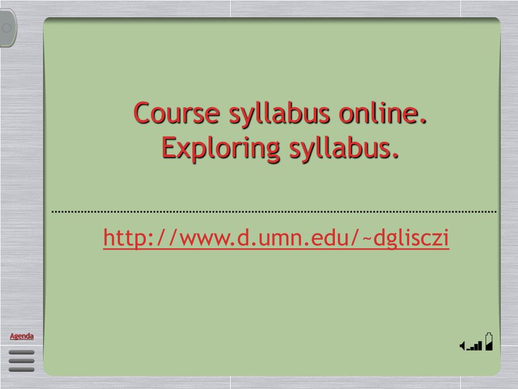 Course syllabus online. Exploring syllabus. http://www.d.umn.edu/~dglisczi Agenda