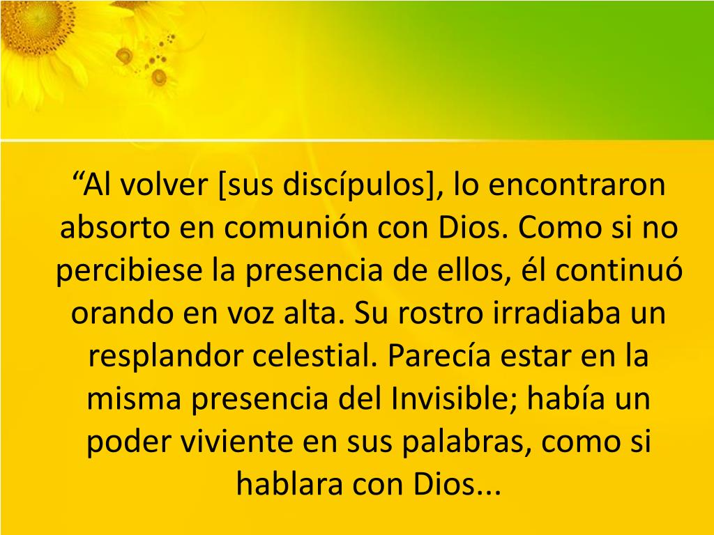 “Al volver [sus discípulos], lo encontraron absorto en comunión con Dios. Como si no percibiese la presencia de ellos, él continuó orando en voz alta. Su rostro irradiaba un resplandor celestial. Parecía estar en la misma presencia del Invisible; había un poder viviente en sus palabras, como si hablara con Dios...