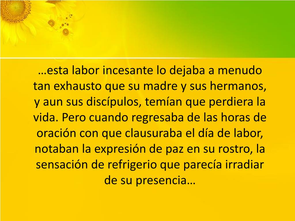 …esta labor incesante lo dejaba a menudo tan exhausto que su madre y sus hermanos, y aun sus discípulos, temían que perdiera la vida. Pero cuando regresaba de las horas de oración con que clausuraba el día de labor, notaban la expresión de paz en su rostro, la sensación de refrigerio que parecía irradiar de su presencia…