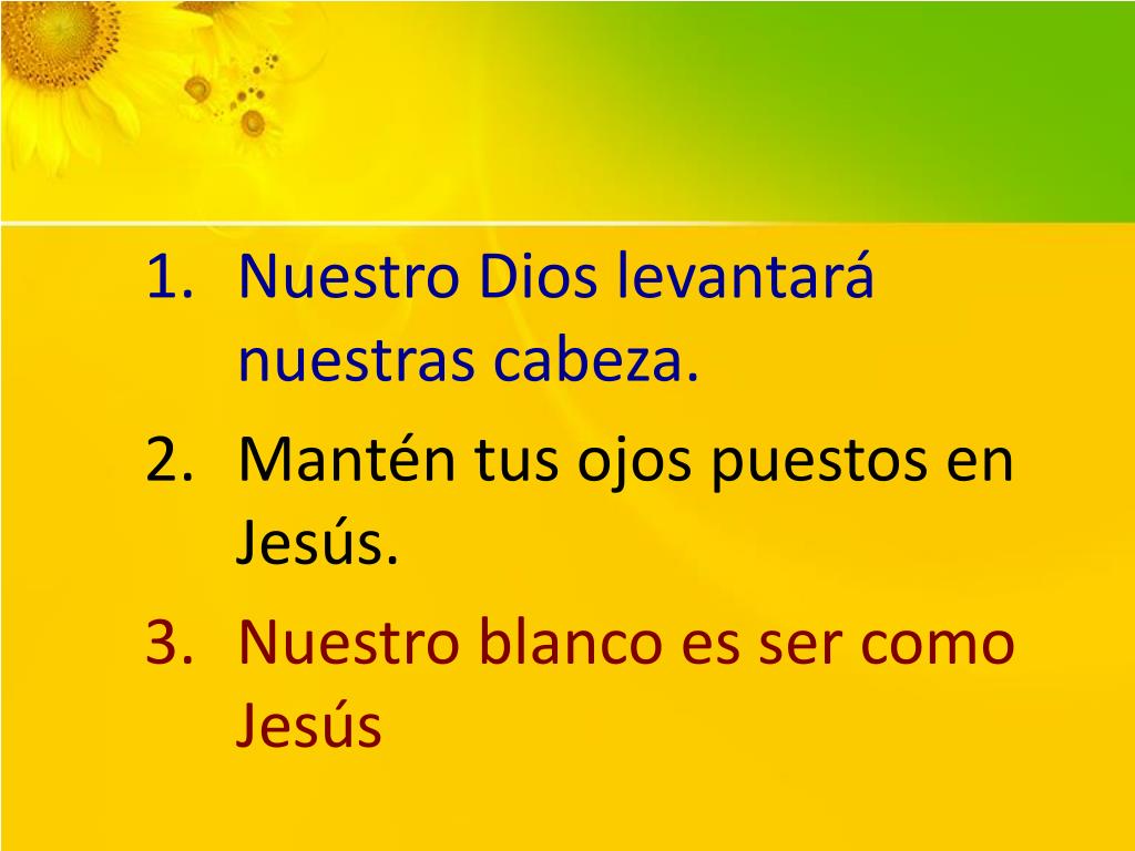 Nuestro Dios levantará nuestras cabeza. • Mantén tus ojos puestos en Jesús. • Nuestro blanco es ser como Jesús
