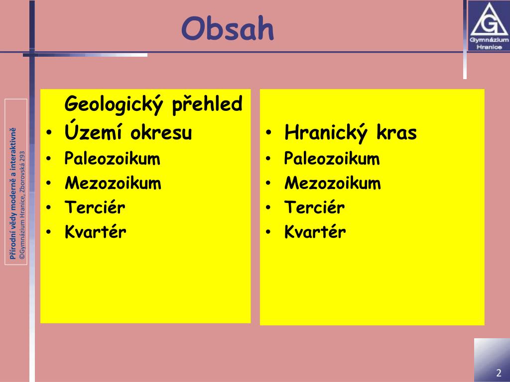 Obsah Geologický přehled • Území okresu • Paleozoikum • Mezozoikum • Terciér • Kvartér • Hranický kras • Paleozoikum • Mezozoikum • Terciér • Kvartér
