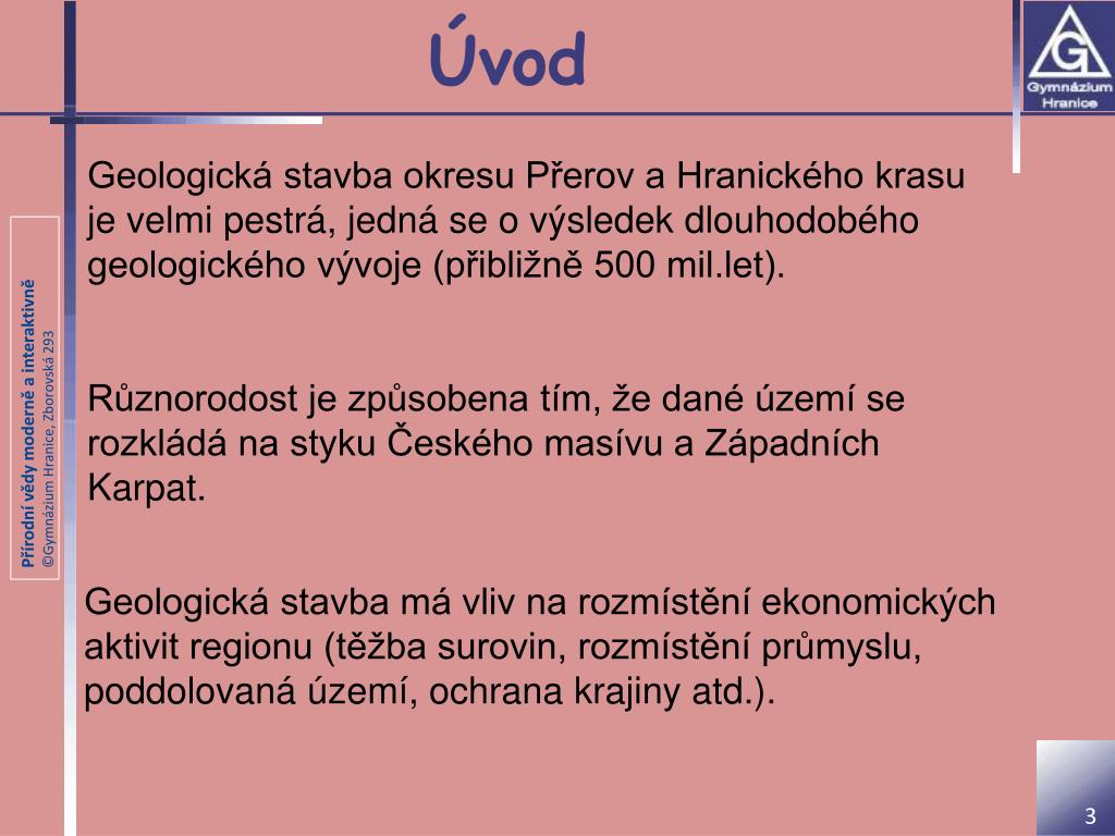 Úvod Geologická stavba okresu Přerov a Hranického krasu je velmi pestrá, jedná se o výsledek dlouhodobého geologického vývoje (přibližně 500 mil.let). Různorodost je způsobena tím, že dané území se rozkládá na styku Českého masívu a Západních Karpat. Geologická stavba má vliv na rozmístění ekonomických aktivit regionu (těžba surovin, rozmístění průmyslu, poddolovaná území, ochrana krajiny atd.).