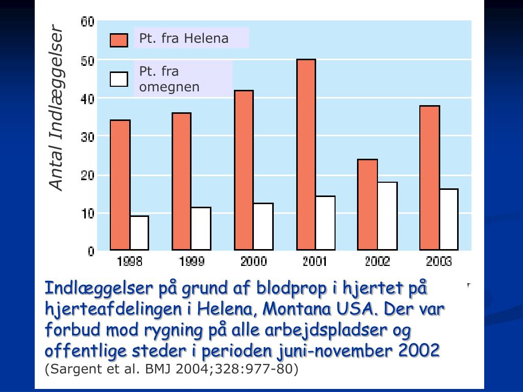 Pt. fra Helena Pt. fra omegnen Antal Indlæggelser Indlæggelser på grund af blodprop i hjertet på hjerteafdelingen i Helena, Montana USA. Der var forbud mod rygning på alle arbejdspladser og offentlige steder i perioden juni-november 2002(Sargent et al. BMJ 2004;328:977-80)