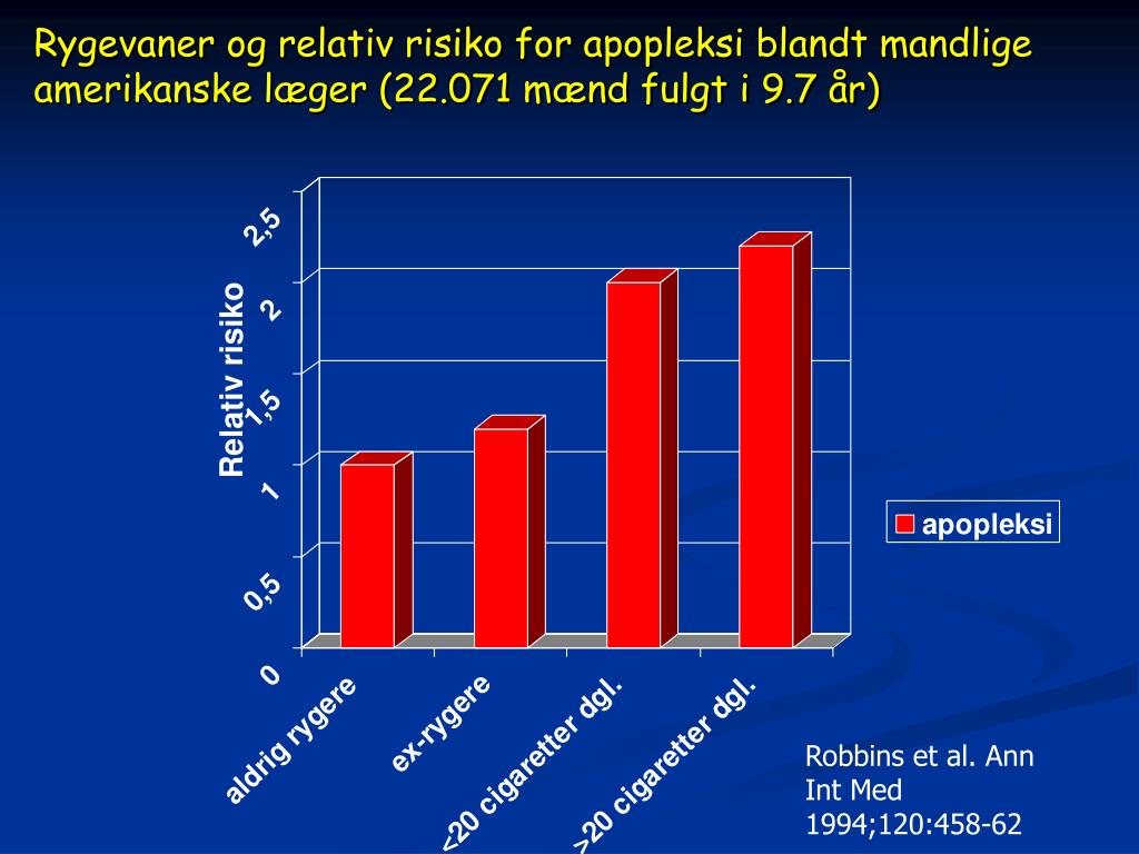 Rygevaner og relativ risiko for apopleksi blandt mandlige amerikanske læger (22.071 mænd fulgt i 9.7 år) Relativ risiko Robbins et al. Ann Int Med 1994;120:458-62