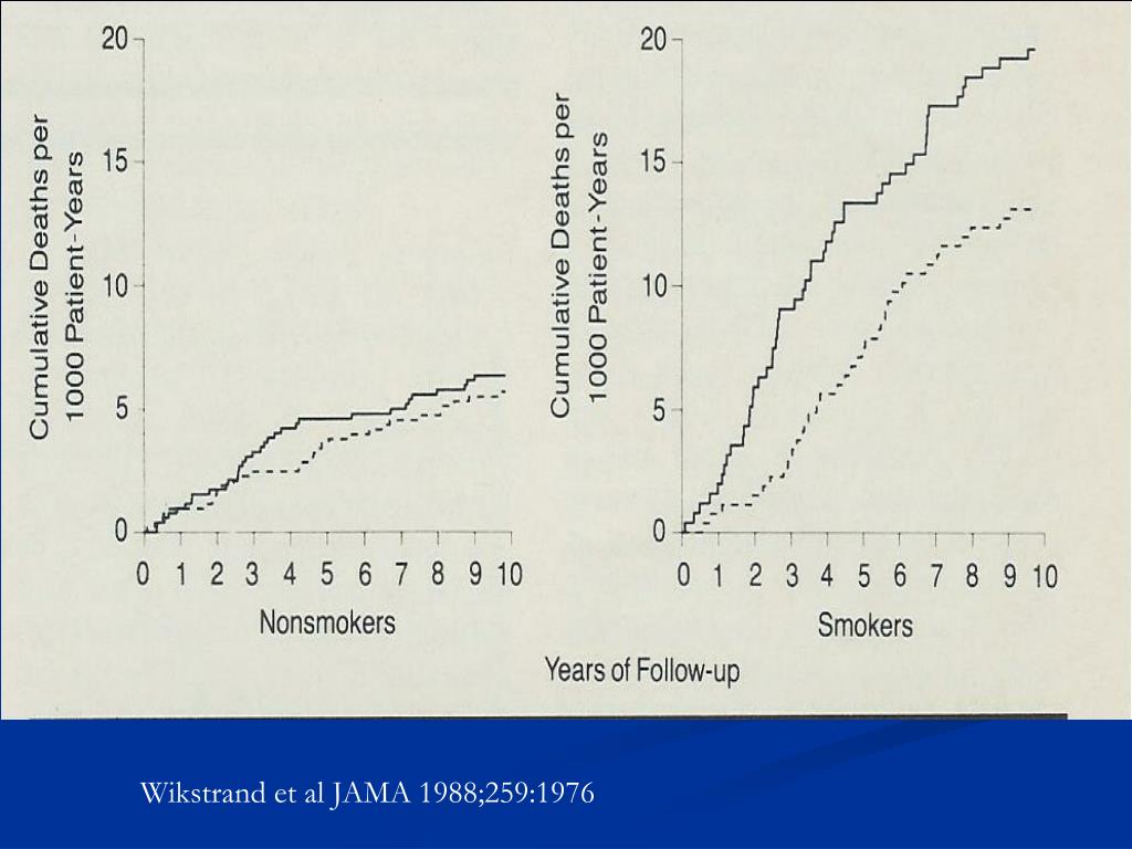 Konklusion • Der er en klar D/R sammenhæng mellem rygning og sygelighed og dødelighed af hjerte-karsygdomme • Rygere halverer risikoen for AMI 1-2 år efter rygestop. • Rygere halverer risikoen for apopleksi indenfor 2-4 år • Rygereduktion reducerer ikke risikoen for koronar sygdom eller risikoen for død af hjerte-karsygdom