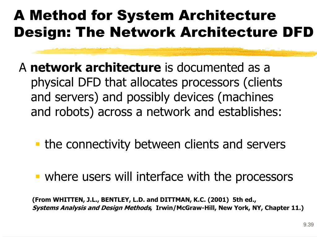 A Method for System Architecture Design: The Network Architecture DFD A network architecture is documented as a physical DFD that allocates processors (clients and servers) and possibly devices (machines and robots) across a network and establishes: • the connectivity between clients and servers • where users will interface with the processors (From WHITTEN, J.L., BENTLEY, L.D. and DITTMAN, K.C. (2001) 5th ed., Systems Analysis and Design Methods, Irwin/McGraw-Hill, New York, NY, Chapter 11.)
