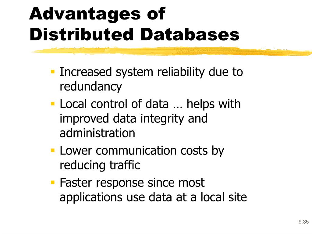 Advantages of Distributed Databases • Increased system reliability due to redundancy • Local control of data … helps with improved data integrity and administration • Lower communication costs by reducing traffic • Faster response since most applications use data at a local site
