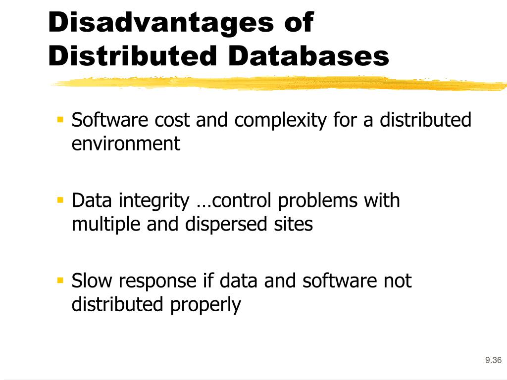 Disadvantages of Distributed Databases • Software cost and complexity for a distributed environment • Data integrity …control problems with multiple and dispersed sites • Slow response if data and software not distributed properly