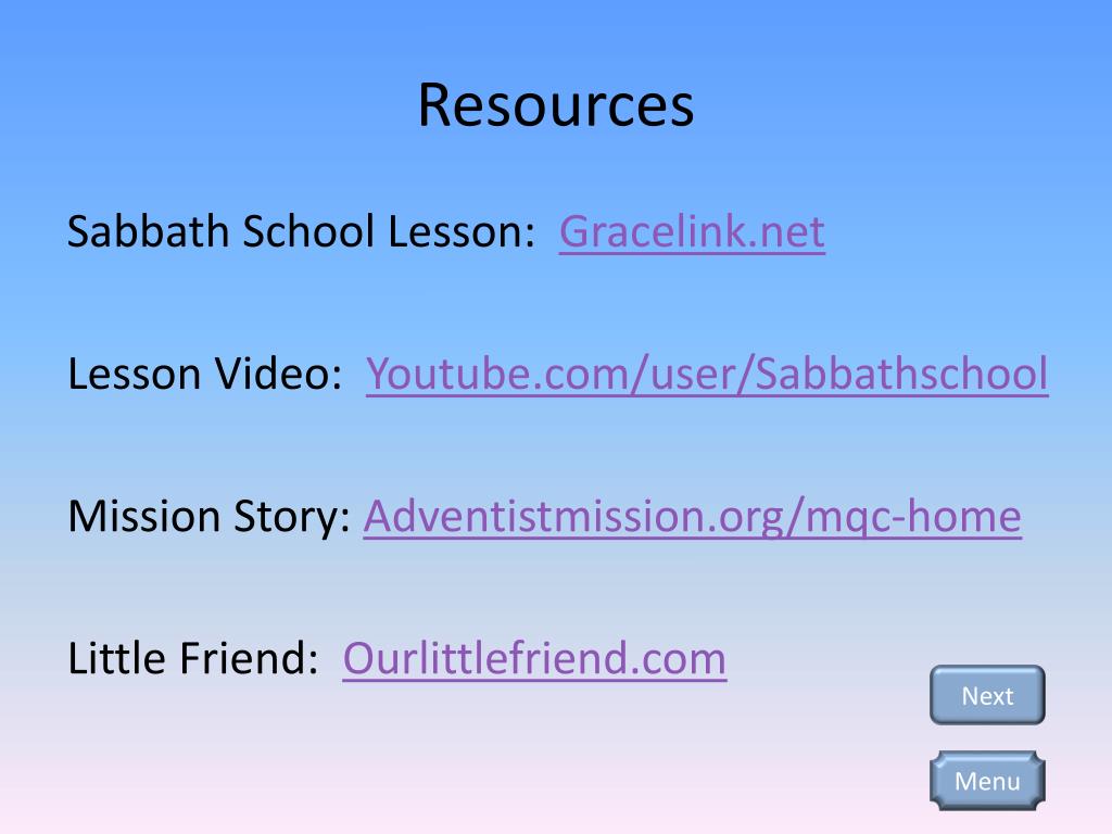 Resources Sabbath School Lesson: Gracelink.net Lesson Video: Youtube.com/user/Sabbathschool Mission Story: Adventistmission.org/mqc-home Little Friend: Ourlittlefriend.com Next Menu
