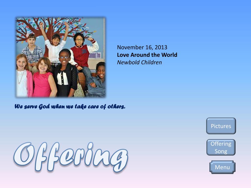 November 16, 2013 Love Around the World Newbold Children We serve God when we take care of others. Pictures Offering Offering Song Menu