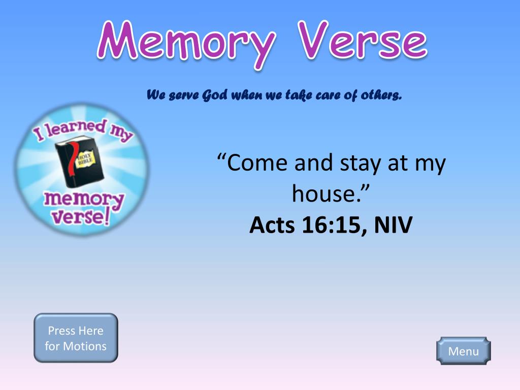 Memory Verse We serve God when we take care of others. “Come and stay at my house.” Acts 16:15, NIV Press Here for Motions Menu