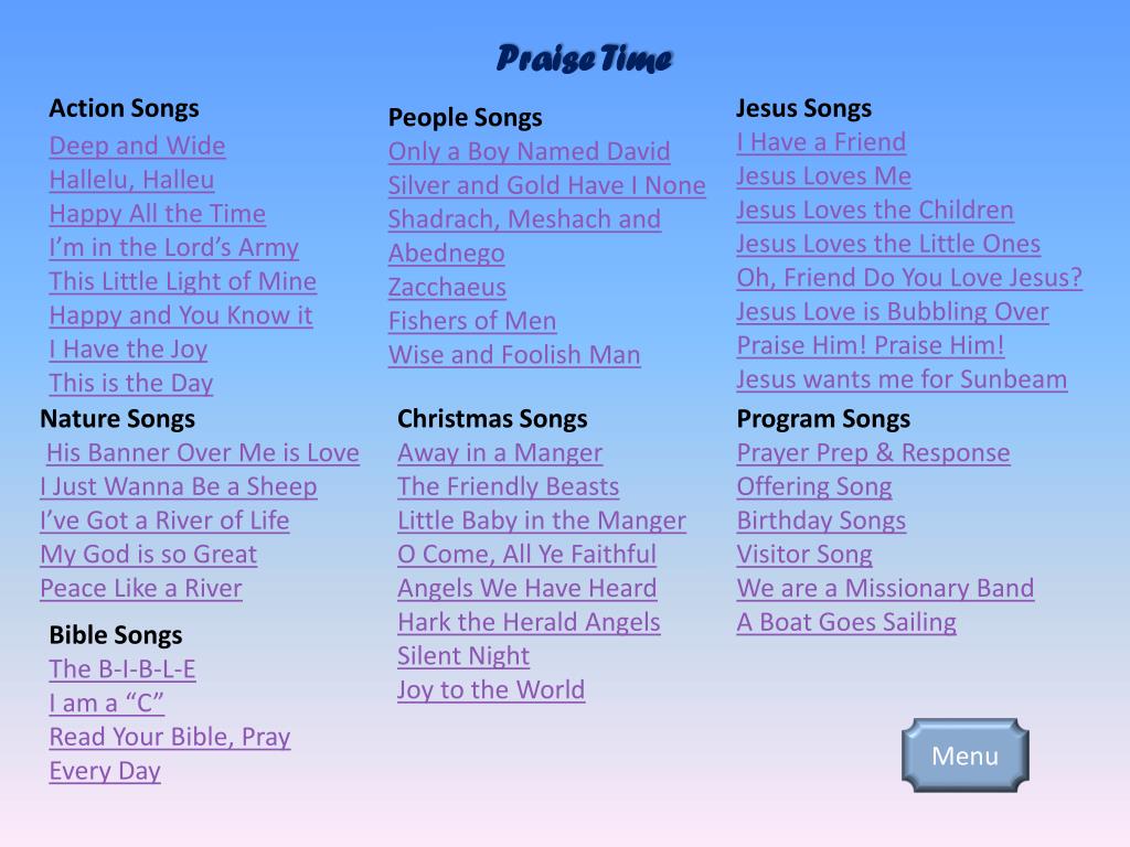 Praise Time Action Songs Jesus Songs I Have a Friend Jesus Loves Me Jesus Loves the Children Jesus Loves the Little Ones Oh, Friend Do You Love Jesus? Jesus Love is Bubbling Over Praise Him! Praise Him! Jesus wants me for Sunbeam People Songs Only a Boy Named David Silver and Gold Have I None Shadrach, Meshach and Abednego Zacchaeus Fishers of Men Wise and Foolish Man Deep and Wide Hallelu, Halleu Happy All the Time I’m in the Lord’s Army This Little Light of Mine Happy and You Know it I Have the Joy This is the Day Nature Songs His Banner Over Me is Love I Just Wanna Be a Sheep I’ve Got a River of Life My God is so Great Peace Like a River Christmas Songs Away in a Manger The Friendly Beasts Little Baby in the Manger O Come, All Ye Faithful Angels We Have Heard Hark the Herald Angels Silent Night Joy to the World Program Songs Prayer Prep & Response Offering Song Birthday Songs Visitor Song We are a Missionary Band A Boat Goes Sailing Bible Songs The B-I-B-L-E I am a “C” Read Your Bible, Pray Every Day Menu