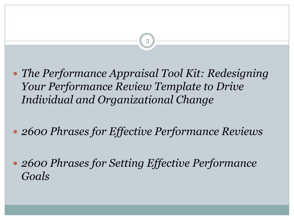 The Performance Appraisal Tool Kit: Redesigning Your Performance Review Template to Drive Individual and Organizational Change • 2600 Phrases for Effective Performance Reviews • 2600 Phrases for Setting Effective Performance Goals