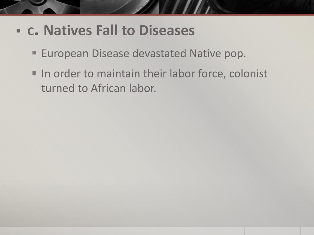 C. Natives Fall to Diseases • European Disease devastated Native pop. • In order to maintain their labor force, colonist turned to African labor.
