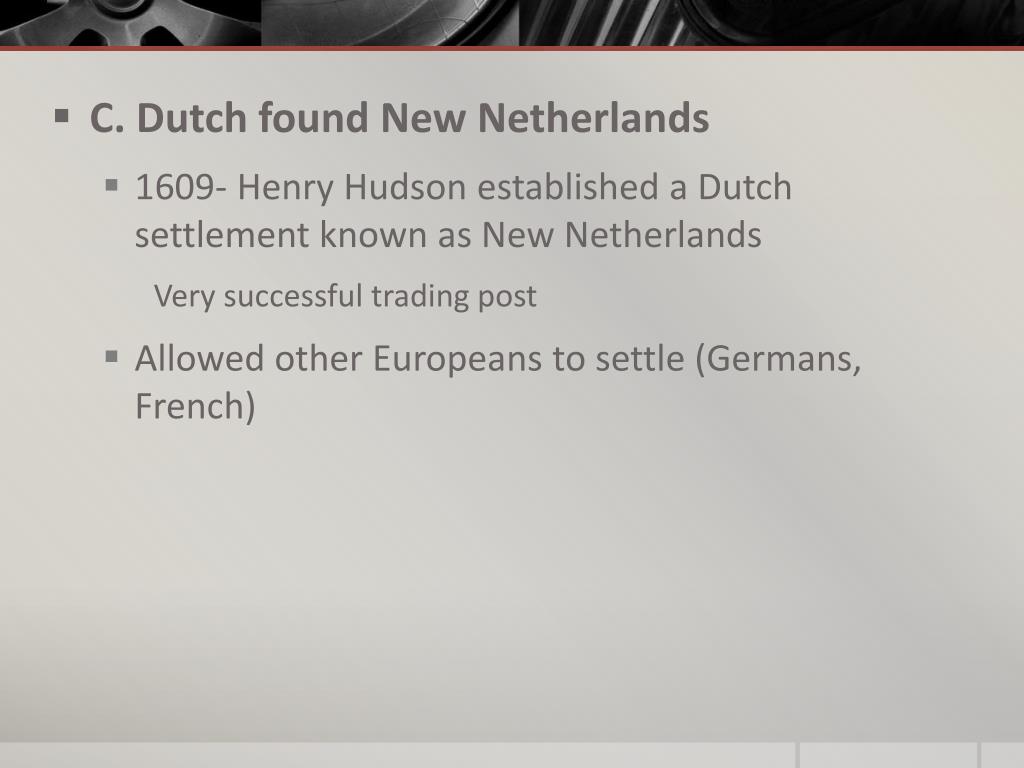 C. Dutch found New Netherlands • 1609- Henry Hudson established a Dutch settlement known as New Netherlands • Very successful trading post • Allowed other Europeans to settle (Germans, French)