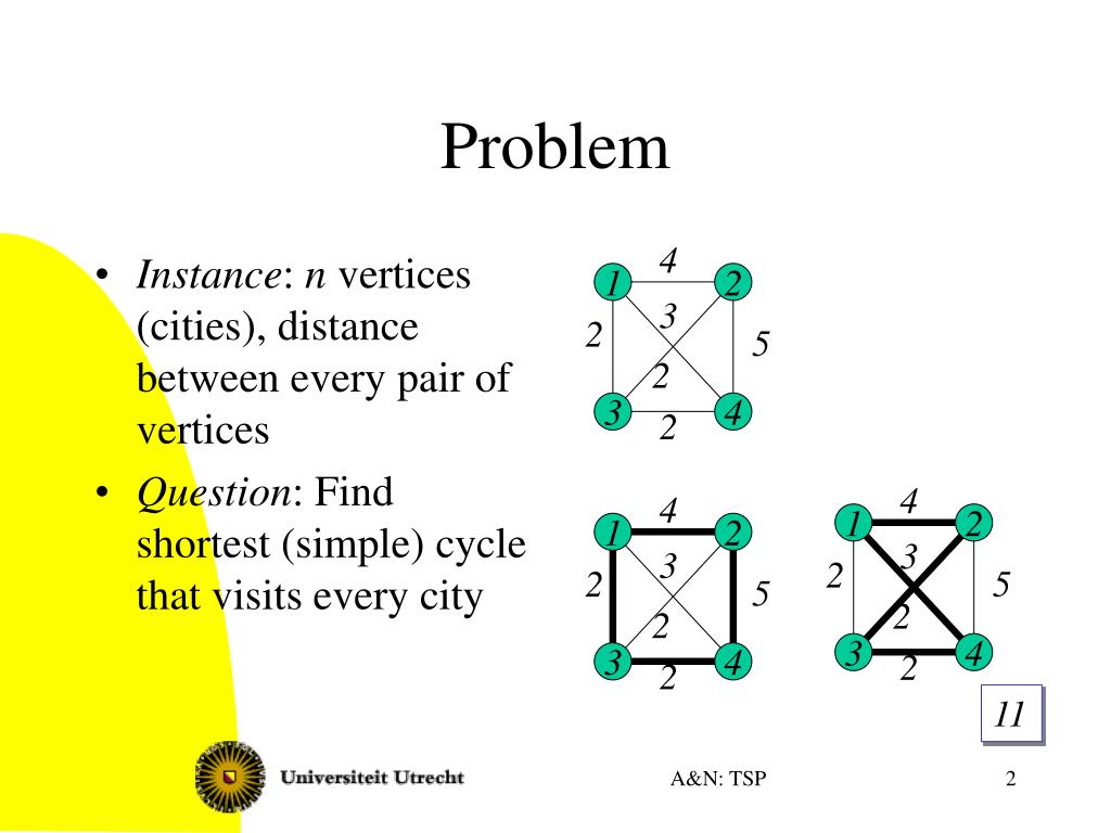 The Traveling Salesperson Problem. Algorithms and Networks. Instance : n vertices (cities), distance between every pair of vertices Question : Find shortest (simple) cycle that visits every city. 4. 1. 2. 3. 2. 5. 2. 3. 4. 2. Problem. 4. 4. 1. 2. 1. 2. 3. 3. 2. 2. 5. 5.