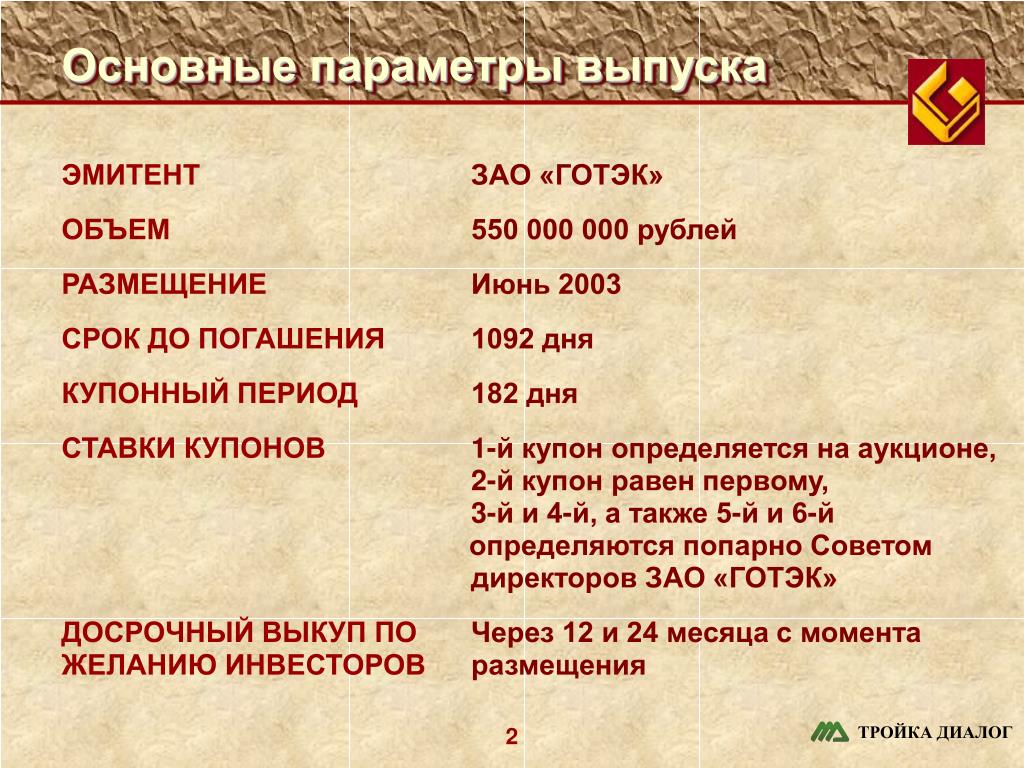 Основные параметры выпуска ЭМИТЕНТЗАО «ГОТЭК» ОБЪЕМ550 000 000 рублей РАЗМЕЩЕНИЕ Июнь 2003 СРОК ДО ПОГАШЕНИЯ1092 дня КУПОННЫЙ ПЕРИОД 182 дня СТАВКИ КУПОНОВ 1-й купон определяется на аукционе, 2-й купон равен первому, 3-й и 4-й, а также 5-й и 6-й определяются попарно Советом директоров ЗАО «ГОТЭК» ДОСРОЧНЫЙ ВЫКУП ПО Через 12 и 24 месяца с момента ЖЕЛАНИЮ ИНВЕСТОРОВ размещения 2
