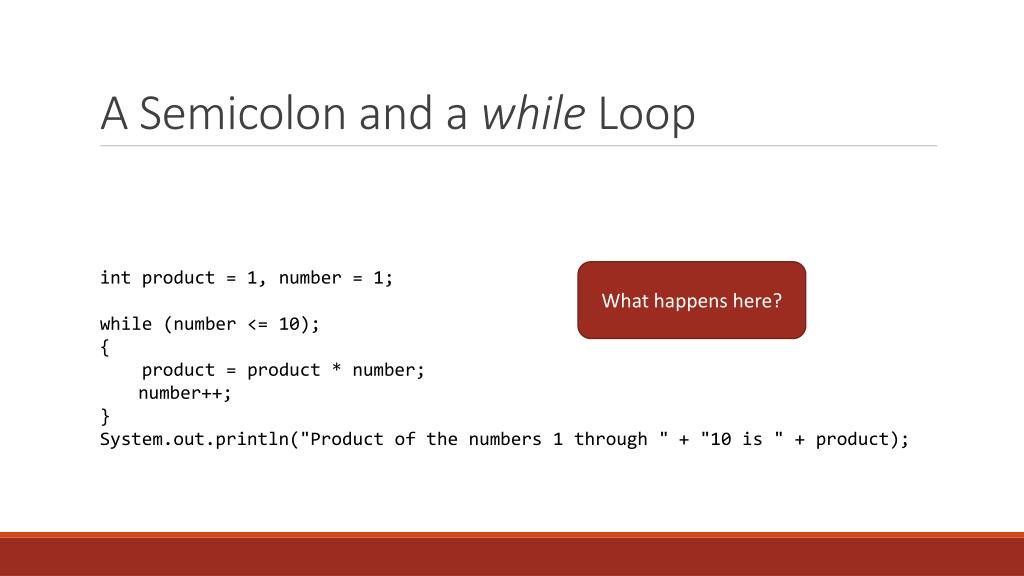A Semicolon and a while Loop int product = 1, number = 1; while (number <= 10); { product = product * number; number++; } System.out.println("Product of the numbers 1 through " + "10 is " + product); What happens here?