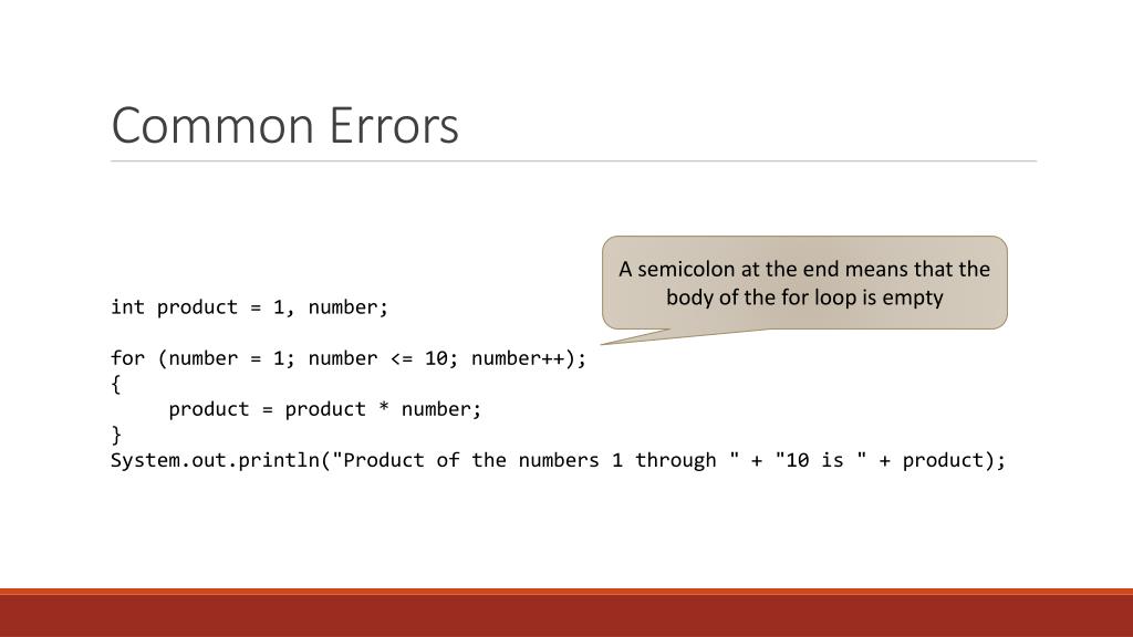 Common Errors A semicolon at the end means that the body of the for loop is empty int product = 1, number; for (number = 1; number <= 10; number++); { product = product * number; } System.out.println("Product of the numbers 1 through " + "10 is " + product);