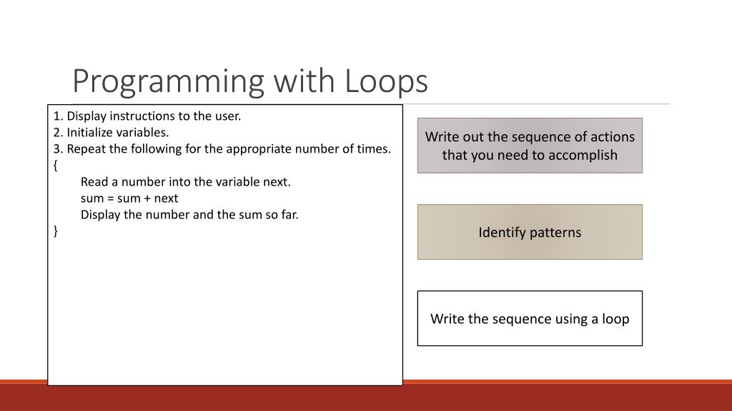 Programming with Loops 1. Display instructions to the user. 2. Initialize variables. 3. Repeat the following for the appropriate number of times. { Read a number into the variable next. sum = sum + next Display the number and the sum so far. } • 1. Display instructions to the user • 2. Initialize variables • 3. Read a number into the variable next. • 4. sum = sum + next • 5. Display the number and the sum so far. • 6. Read another number into the variable next. • 7. sum = sum + next • 8. Display the number and the sum so far. • 9. Read another number into the variable next. • 10. sum = sum + next • 11. Display the number and the sum so far. • 12. Read another number into the variable next. Write out the sequence of actions that you need to accomplish Identify patterns Write the sequence using a loop