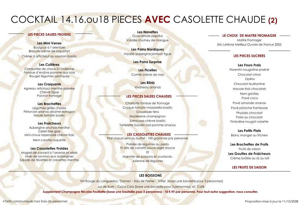 LES PIECES SALEES FROIDES Les Mini Verres Boulgour à l’orientale Brocolis crème de roquefort Crème d artichaut au saumon basilic Les Cuillères Compotée de choux à l’indienne Fondue d’endive pomme aux noix Rouget légumes asiatiques Les Craquants Agneau artichaut menthe poivrée Chèvre figue Poivron fromage Les Brochettes Légumes grillés chorizo Pétoncle ananas sésame estragon Moule tomate basilic Les Fraîcheurs Aubergine anchois menthe Céleri foie gras Mini choux tapenade chèvre frais Nem carotte roquette Les Cassolettes Froides Magret de canard à l’ananas et xérès Maki de saumon aux aubergines Salade de févettes et crevettes menthe COCKTAIL 14.16.ou18 PIECES AVEC CASOLETTE CHAUDE (2) LE CHOIX DE MAITRE FROMAGER Maitre Fromager Eric Lefèvre Meilleur Ouvrier de France 2005 LES PIECES SUCREES Les Fours Frais Florentin nougatine praliné Chocolat citron Opéra Chocolat feuillantine Mousse trois chocolats Nem griottes Pavé coco Pavé amande ananas Pavé pistache framboise Physialis chocolat Poire au chocolat Timbaline nougat noisette Les Petits Plats Blanc manger au litchee Les Brochettes de Fruits Fruits de saison Les Gouttes de Fraîcheurs Crème brûlée au riz au lait LES FRUITS DE SAISON Les Navettes Guacamole paprika Volaille chutney de mangue Les Pains Nordiques Volaille aubergine jambon figue Les Pains Surprise Les Ficelles Comté crème de noix Les Blinis Vivaneau ananas LES PIECES SALEES CHAUDES Charlotte fondue de fromage Croque tomate mozzarella basilic Croustade fêta Madeleine champignon Samoussa chèvre basilic Tartelette boudin noir pomme ananas LES CASSOLETTES CHAUDES Plat chaud servi au buffet - 100 grammes par personne Poêlée de légumes au pesto Et dès de canard sauce aigre douce Et Marmite de poissons et crustacés, Julienne de légumes LES BOISSONSVin Rouge du Languedoc ‘Dames’ - Eau de Perrier - Vittel (base une bouteille pour 3 personnes)Jus de fruits – Coca Cola (base une bouteille pour 3 personnes) et Café Supplément Champagne Nicolas Feuillatte (base une bouteille pour 3 personnes) : 10 € HT par personne. Pour tout autre suggestion, nous consulter. • Tarifs communiqués hors frais de personnel. Proposition mise à jour le 11/10/2008