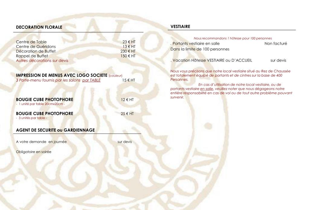 DECORATION FLORALE Centre de Table 23 € HT Centre de Guéridons 13 € HT Décoration de Buffet 230 € HT Rappel de Buffet 150 € HT Autres décorations sur devis IMPRESSION DE MENUS AVEC LOGO SOCIETE (couleur) 3 Porte-menu fournis par les salons par TABLE15 € HT BOUGIE CUBE PHOTOPHORE 12 € HT - 1 unité par table 20cmx20cm - BOUGIE CUBE PHOTOPHORE 25 € HT - 3 unités par table - VESTIAIRE Nous recommandons 1 hôtesse pour 100 personnes . Portants vestiaire en salle Non facturé Dans la limite de 100 personnes . Vacation Hôtesse VESTIAIRE ou D’ACCUEIL sur devis Nous vous précisons que notre local vestiaire situé au Rez de Chaussée est totalement équipé de portants et de cintres sur la base de 400 Personnes. En cas d’utilisation de notre local vestiaire, ou de portants vestiaire en salle, veuillez noter que nous dégageons notre entière responsabilité en cas de vol ou de tout autre problème pouvant survenir. AGENT DE SECURITE ou GARDIENNAGE A votre demande en journée sur devis Obligatoire en soirée