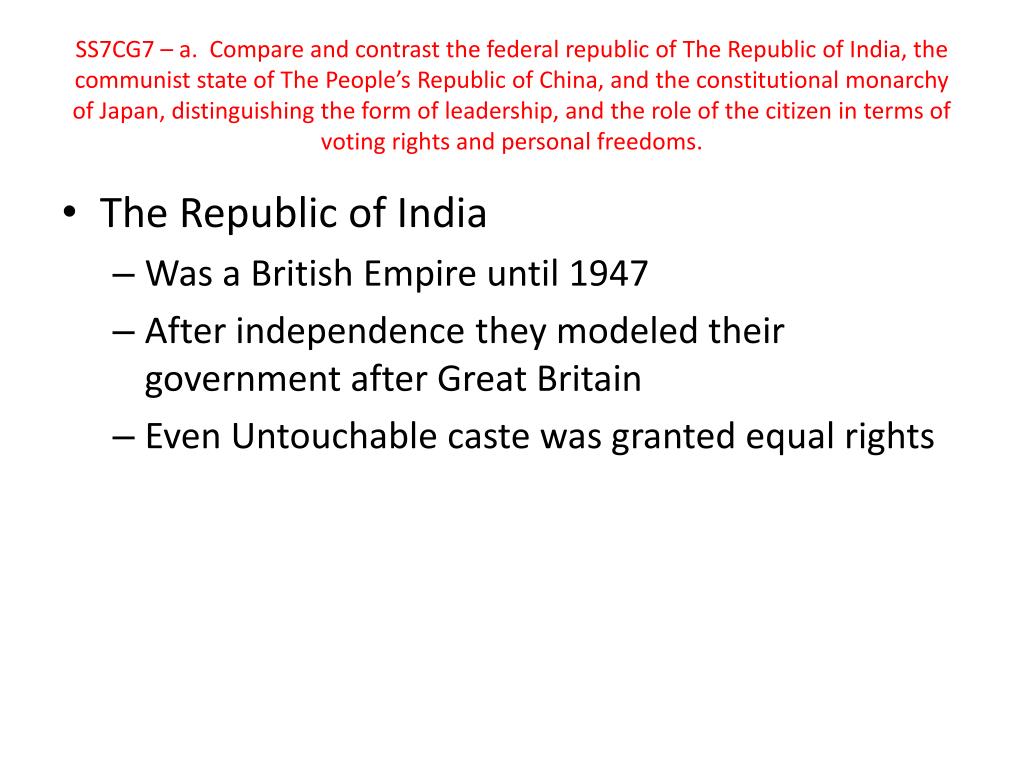 SS7CG7 – a. Compare and contrast the federal republic of The Republic of India, the communist state of The People’s Republic of China, and the constitutional monarchy of Japan, distinguishing the form of leadership, and the role of the citizen in terms of voting rights and personal freedoms. • The Republic of India • Was a British Empire until 1947 • After independence they modeled their government after Great Britain • Even Untouchable caste was granted equal rights