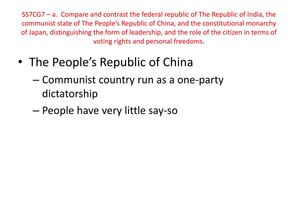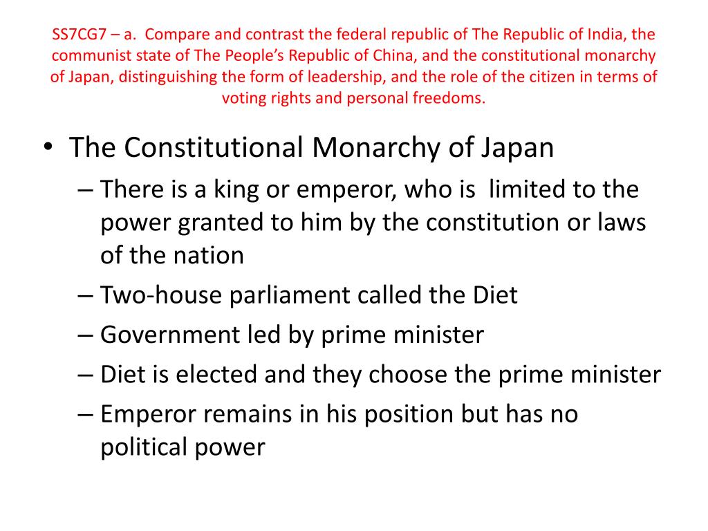 SS7CG7 – a. Compare and contrast the federal republic of The Republic of India, the communist state of The People’s Republic of China, and the constitutional monarchy of Japan, distinguishing the form of leadership, and the role of the citizen in terms of voting rights and personal freedoms. • The Constitutional Monarchy of Japan • There is a king or emperor, who is limited to the power granted to him by the constitution or laws of the nation • Two-house parliament called the Diet • Government led by prime minister • Diet is elected and they choose the prime minister • Emperor remains in his position but has no political power