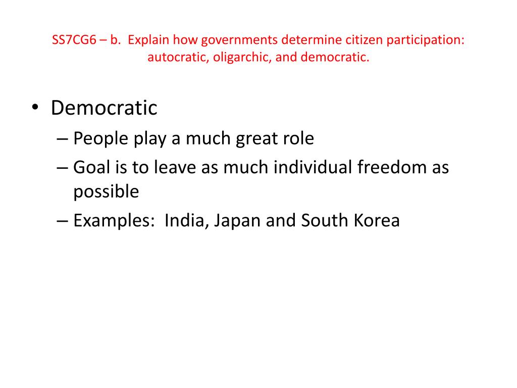 SS7CG6 – b. Explain how governments determine citizen participation: autocratic, oligarchic, and democratic. • Democratic • People play a much great role • Goal is to leave as much individual freedom as possible • Examples: India, Japan and South Korea