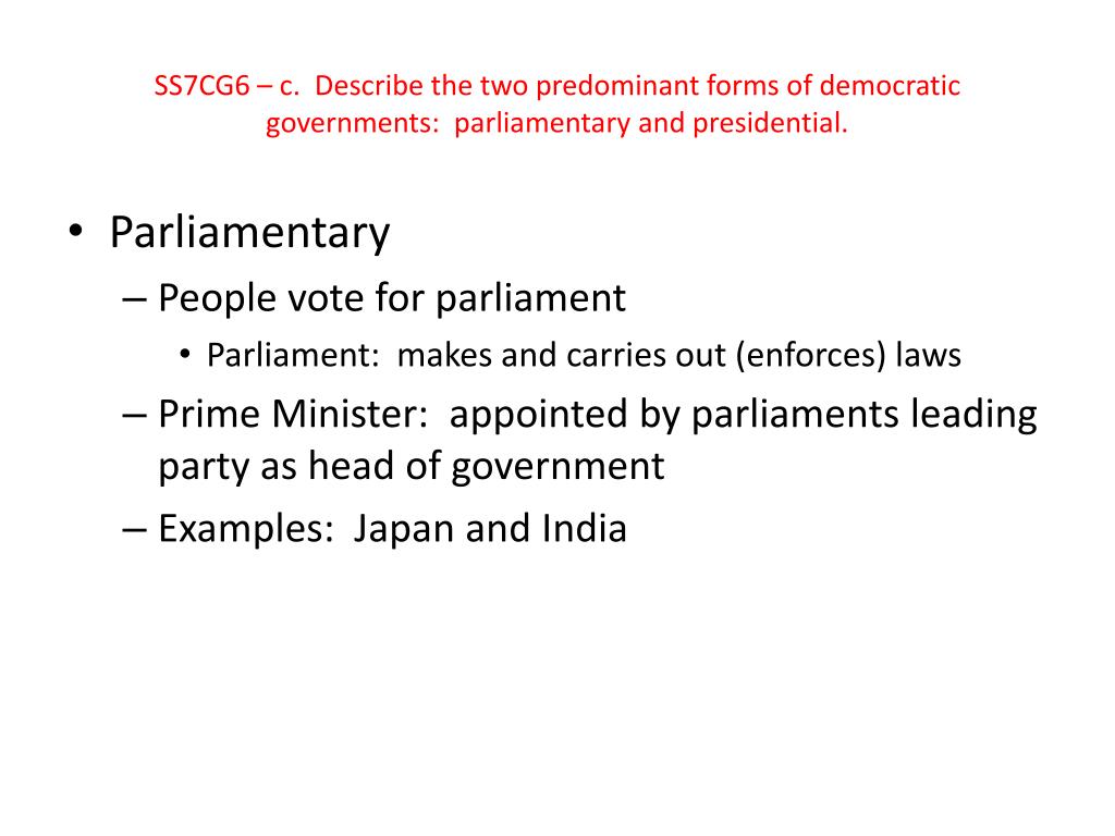 SS7CG6 – c. Describe the two predominant forms of democratic governments: parliamentary and presidential. • Parliamentary • People vote for parliament • Parliament: makes and carries out (enforces) laws • Prime Minister: appointed by parliaments leading party as head of government • Examples: Japan and India