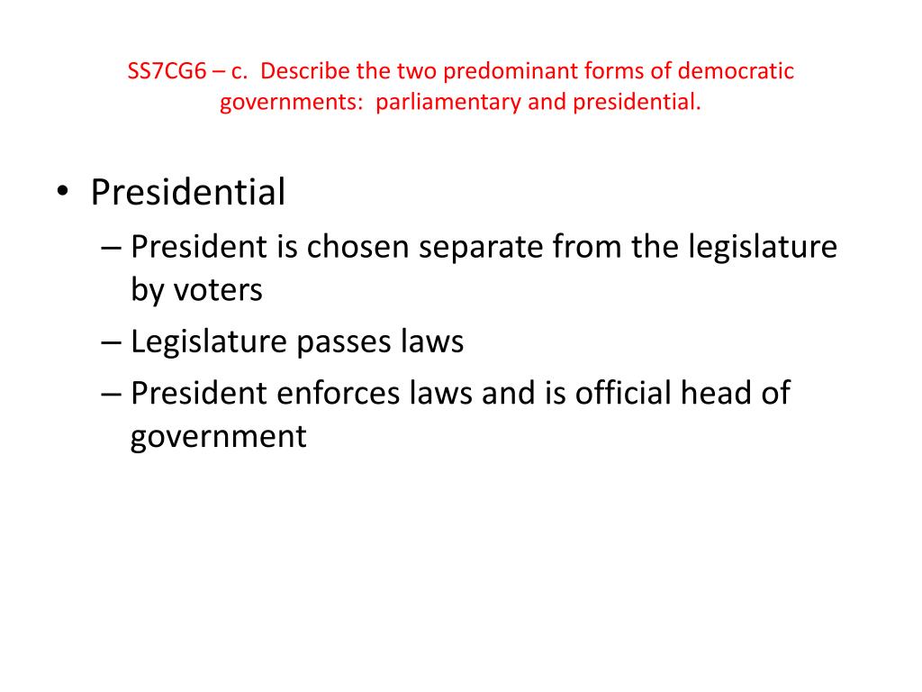 SS7CG6 – c. Describe the two predominant forms of democratic governments: parliamentary and presidential. • Presidential • President is chosen separate from the legislature by voters • Legislature passes laws • President enforces laws and is official head of government
