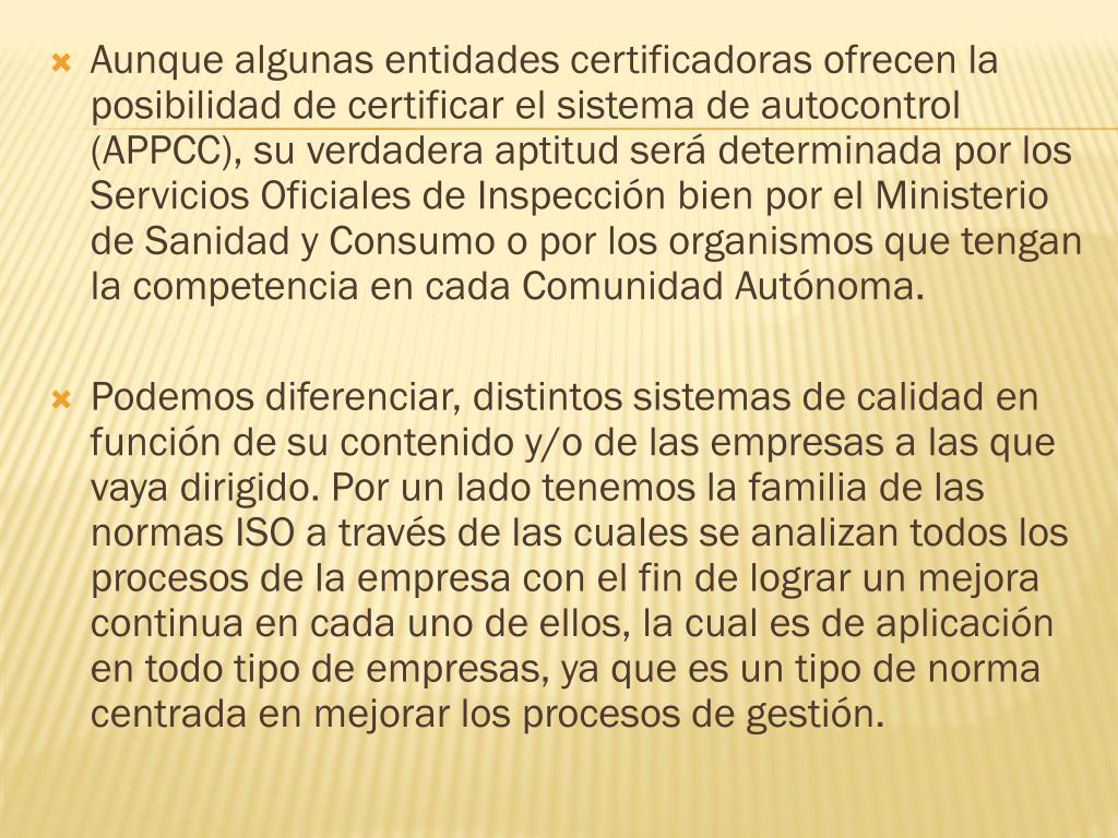 Aunque algunas entidades certificadoras ofrecen la posibilidad de certificar el sistema de autocontrol (APPCC), su verdadera aptitud será determinada por los Servicios Oficiales de Inspección bien por el Ministerio de Sanidad y Consumo o por los organismos que tengan la competencia en cada Comunidad Autónoma. Podemos diferenciar, distintos sistemas de calidad en función de su contenido y/o de las empresas a las que vaya dirigido. Por un lado tenemos la familia de las normas ISO a través de las cuales se analizan todos los procesos de la empresa con el fin de lograr un mejora continua en cada uno de ellos, la cual es de aplicación en todo tipo de empresas, ya que es un tipo de norma centrada en mejorar los procesos de gestión.