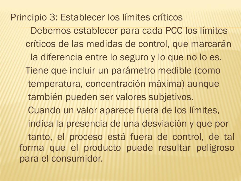 Principio 3: Establecer los límites críticos Debemos establecer para cada PCC los límites críticos de las medidas de control, que marcarán la diferencia entre lo seguro y lo que no lo es. Tiene que incluir un parámetro medible (como temperatura, concentración máxima) aunque también pueden ser valores subjetivos. Cuando un valor aparece fuera de los límites, indica la presencia de una desviación y que por tanto, el proceso está fuera de control, de tal forma que el producto puede resultar peligroso para el consumidor.
