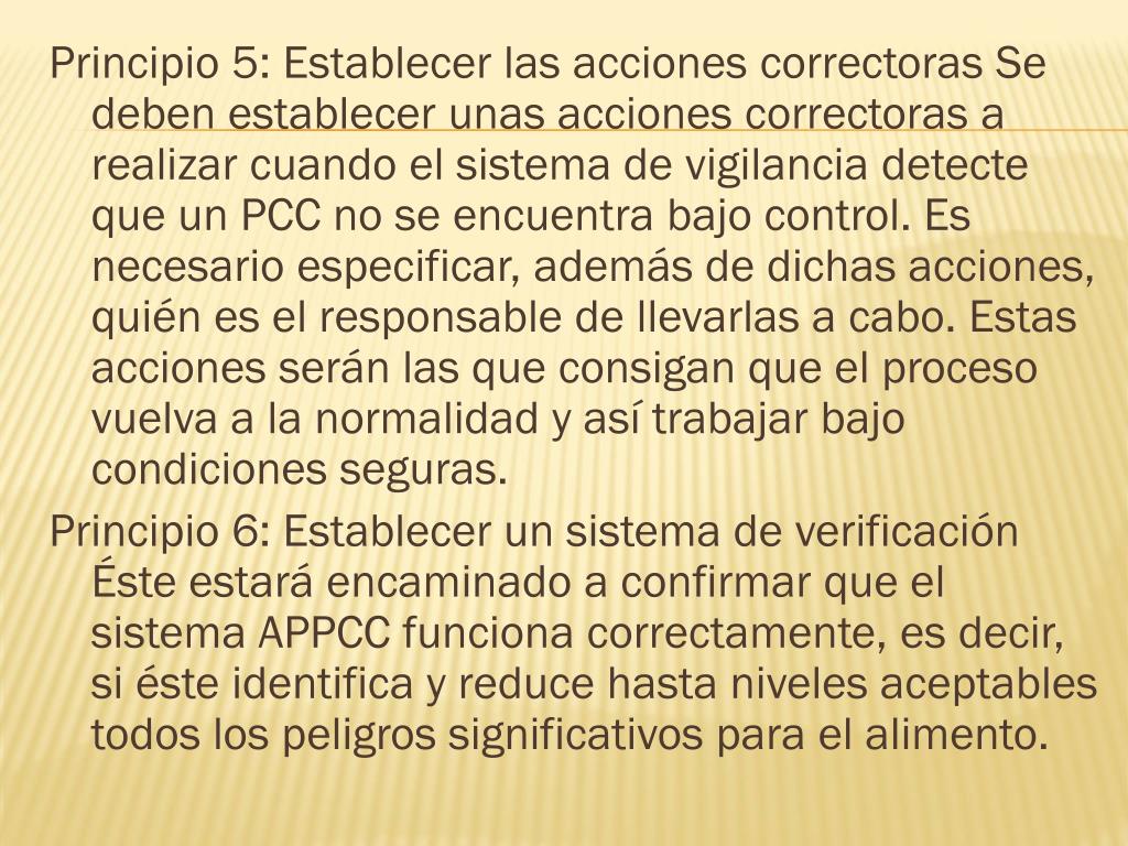 Principio 5: Establecer las acciones correctoras Se deben establecer unas acciones correctoras a realizar cuando el sistema de vigilancia detecte que un PCC no se encuentra bajo control. Es necesario especificar, además de dichas acciones, quién es el responsable de llevarlas a cabo. Estas acciones serán las que consigan que el proceso vuelva a la normalidad y así trabajar bajo condiciones seguras. Principio 6: Establecer un sistema de verificación Éste estará encaminado a confirmar que el sistema APPCC funciona correctamente, es decir, si éste identifica y reduce hasta niveles aceptables todos los peligros significativos para el alimento.