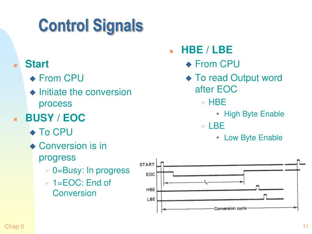Start From CPU Initiate the conversion process BUSY / EOC To CPU Conversion is in progress 0=Busy: In progress 1=EOC: End of Conversion HBE / LBE From CPU To read Output word after EOC HBE High Byte Enable LBE Low Byte Enable Control Signals Chap 0