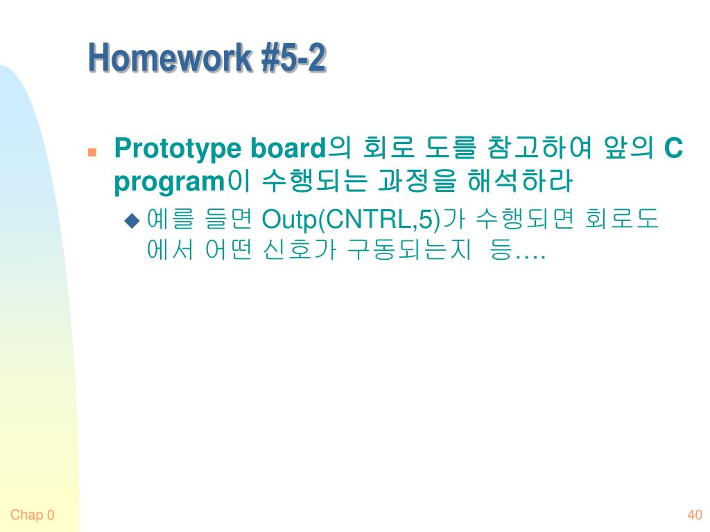 Homework #5-2 • Prototype board의 회로 도를 참고하여 앞의 C program이 수행되는 과정을 해석하라 • 예를 들면 Outp(CNTRL,5)가 수행되면 회로도 에서 어떤 신호가 구동되는지 등…. Chap 0