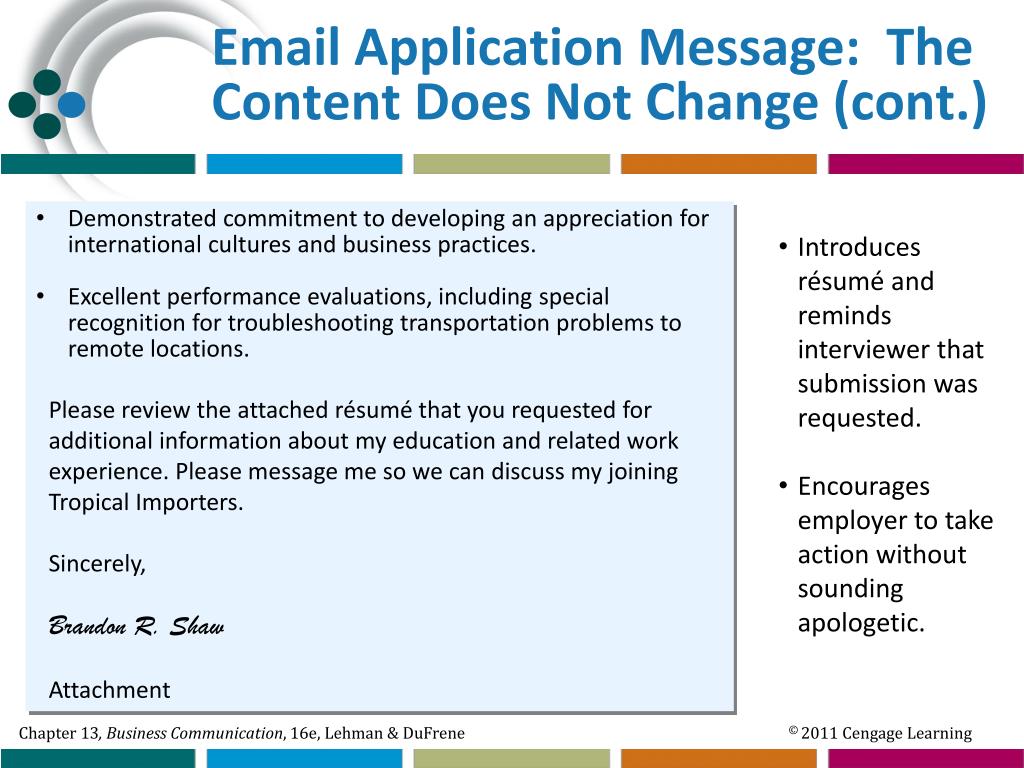 Email Application Message: The Content Does Not Change (cont.) • Demonstrated commitment to developing an appreciation for international cultures and business practices. • Excellent performance evaluations, including special recognition for troubleshooting transportation problems to remote locations. • Please review the attached résumé that you requested for additional information about my education and related work experience. Please message me so we can discuss my joining • Tropical Importers. • Sincerely, • Brandon R. Shaw • Attachment • Introduces résumé and reminds interviewer that submission was requested. • Encourages employer to take action without sounding apologetic.